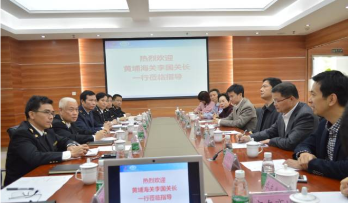 1月29日,黄埔海关李国关长、黄埔老港海关陈平关长、黄埔出入境检验检疫局宋永乐副局长一行到我司国家电子商务示范基地——状元谷园区调研跨境电商工作